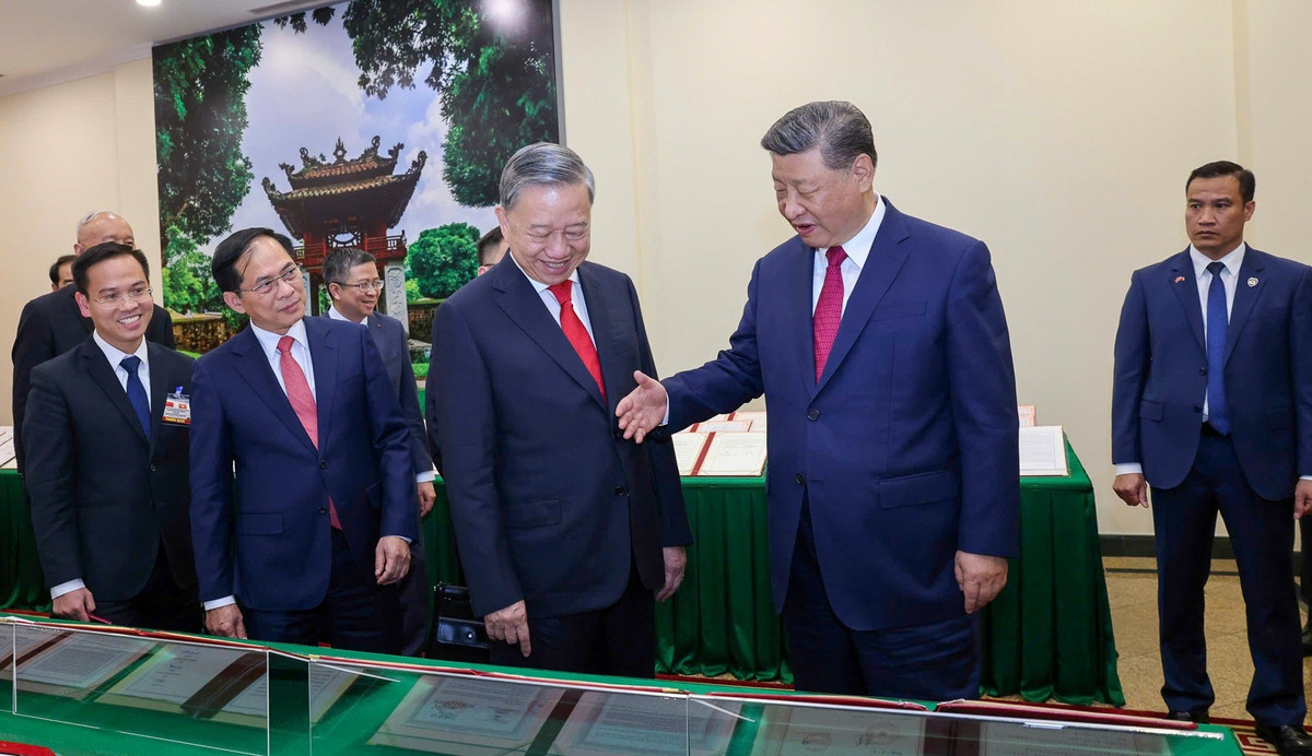 Tổng Bí thư Tô Lâm và Tổng Bí thư, Chủ tịch nước Trung Quốc Tập Cận Bình chứng kiến trưng bày các văn kiện hợp tác giữa hai nước.