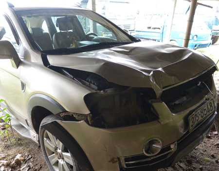 Trong khi kiểm tra gara sửa xe Mạnh Điền Chung ở xóm 13, phát hiện có xe ô tô Chevrolet Captiva bị che kín biển số, hư hỏng nặng phía đầu xe.