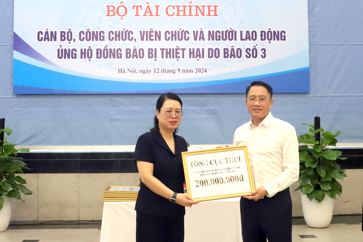 Chủ tịch Công đoàn Bộ Tài chính Ngô Thị Nhung tiếp nhận số tiền 200 triệu đồng do Phó Tổng cục trưởng Tổng cục Thuế Mai Sơn trao ủng hộ đồng bào bị thiệt hại do bão số 3.