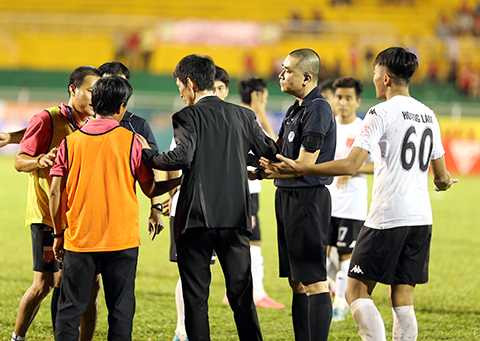 Trọng tài Nguyễn Trọng Thư trong vòng vây cầu thủ và lãnh đội Long An trên sân Thống Nhất. Ảnh Liêm: Hồ