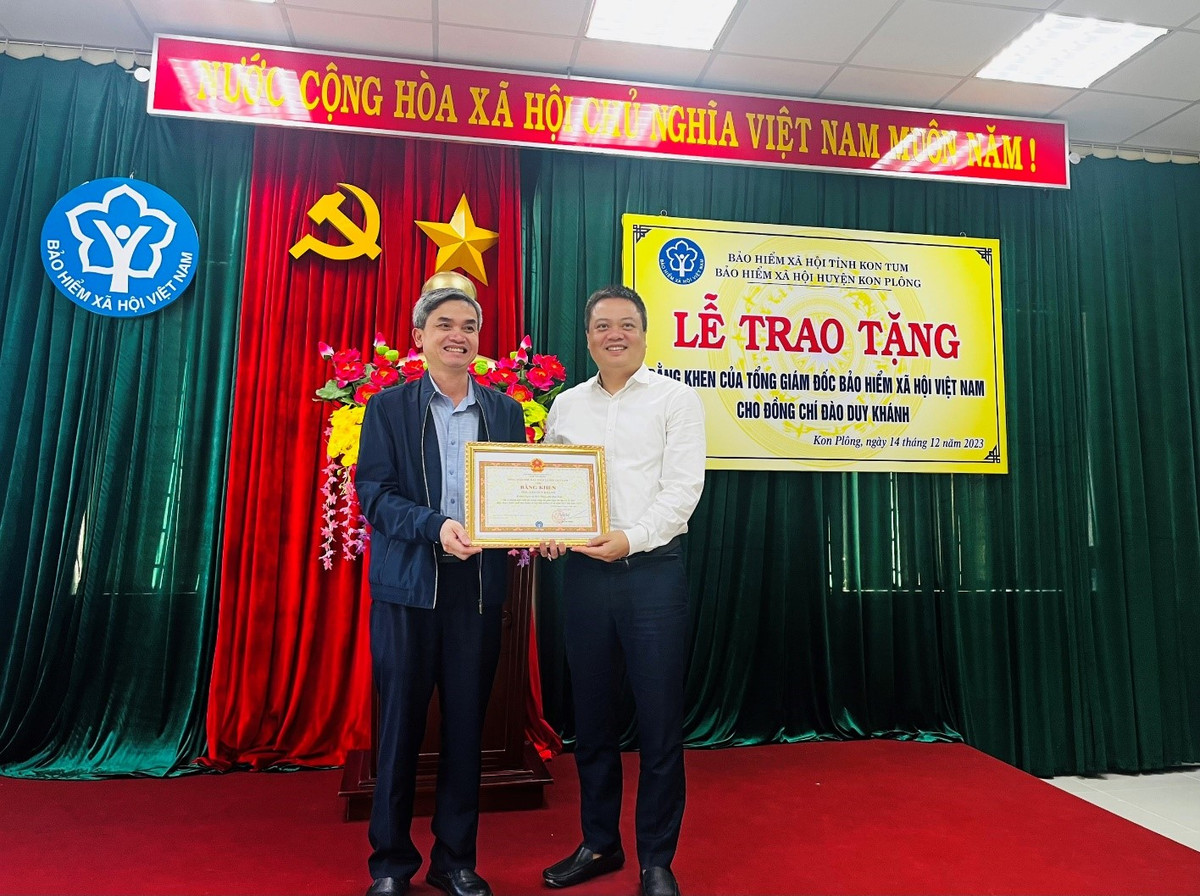 Thừa ủy quyền của Tổng Giám đốc BHXH Việt Nam, ông Vũ Mạnh Chữ - Giám đốc BHXH tỉnh Kon Tum đã trao tặng bằng khen của Tổng giám đốc BHXH Việt Nam cho cá nhân ngoài ngành trên địa bàn huyện Kon Plông có thành tích xuất sắc trong công tác phối hợp, chỉ đạo và tổ chức thực hiện chính sách BHXH, BHYT giai đoạn 2021-2022.