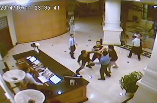 | Cảnh hỗn chiến trong khách sạn 4 sao tại Hải Phòng - Ảnh cắt ra từ clip do camera của khách sạn ghi lại |
