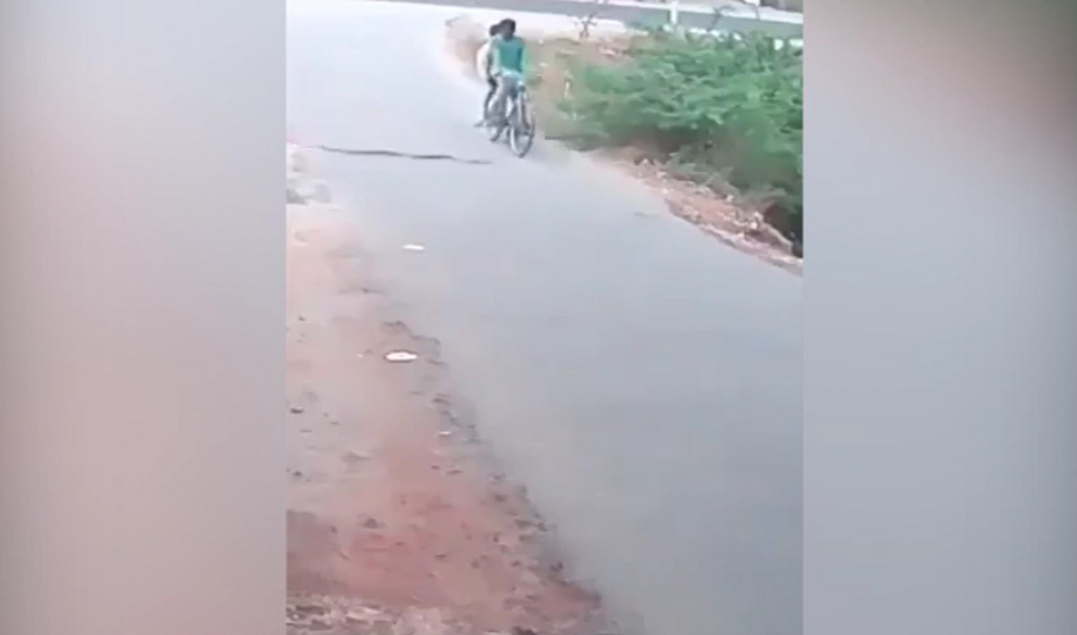 Con rắn bò sang đường bị quấn vào bánh xe đạp khiến hai thanh niên sợ hãi vứt xe bỏ chạy.