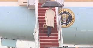 Video đăng tải cho thấy, ông Biden ra sân bay, bước lên cầu thang vào thời điểm trời đang mưa. Tổng thống thứ 46 nước Mỹ một tay cầm ô, tay còn lại cầm túi xách, bước những bước đi chậm rãi, cẩn thận lên cầu thang,