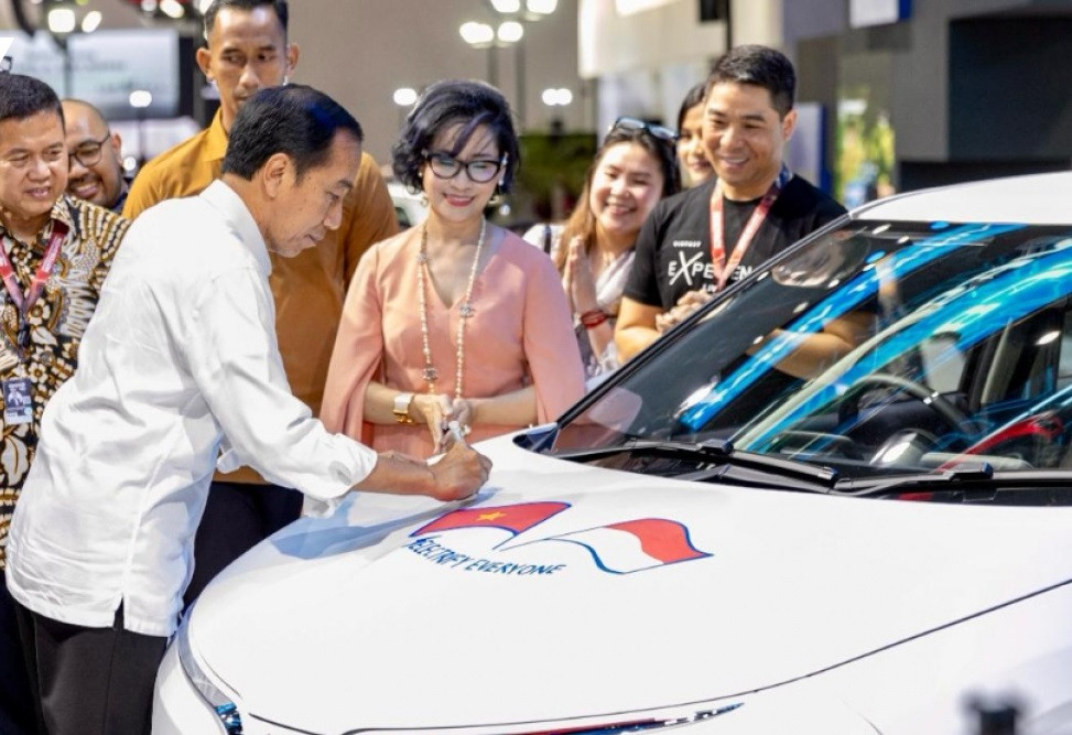 Tổng thống Indonesia Joko Widodo tham quan và ký tặng lên mẫu xe VF 5 trưng bày tại gian hàng VinFast.