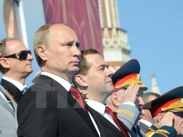 Tổng thống Nga Vladimir Putin (trái) và Thủ tướng Nga Dmitry Medvedev (thứ 2, trái) dự lễ kỷ niệm Ngày Chiến thắng ở Quảng trường Đỏ ngày 9/5