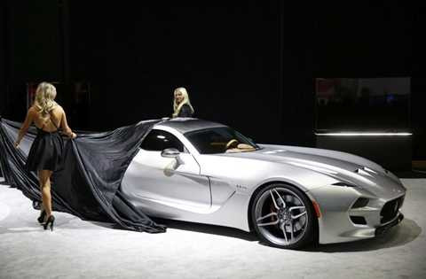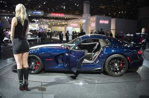 Người mẫu đứng bên chiếc Dodge Viper của GM tại triển lãm