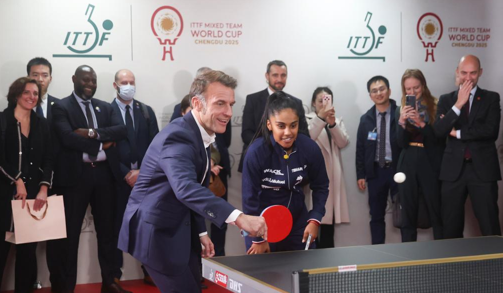 Tổng thống Pháp Emmanuel Macron đã gặp các vận động viên bóng bàn Trung Quốc và Pháp đang tham dự Giải World Cup Đồng đội Hỗn hợp ITTF 2025 tại Thành Đô.