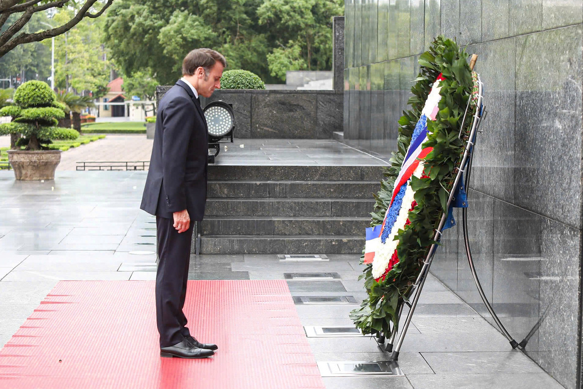 Tổng thống Pháp Emmanuel Macron đặt vòng hoa và kính cẩn tưởng niệm Chủ tịch Hồ Chí Minh.