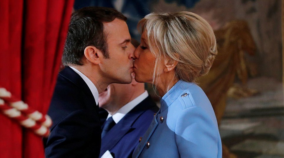 Tổng thống trẻ nhất lịch sử nước Pháp Emmanuel Macron trao cho người vợ 64 tuổi nụ hôn ngọt ngào sau khi tuyên thệ nhậm chức tại cung điện Elysee, thủ đô Paris ngày 14/5.