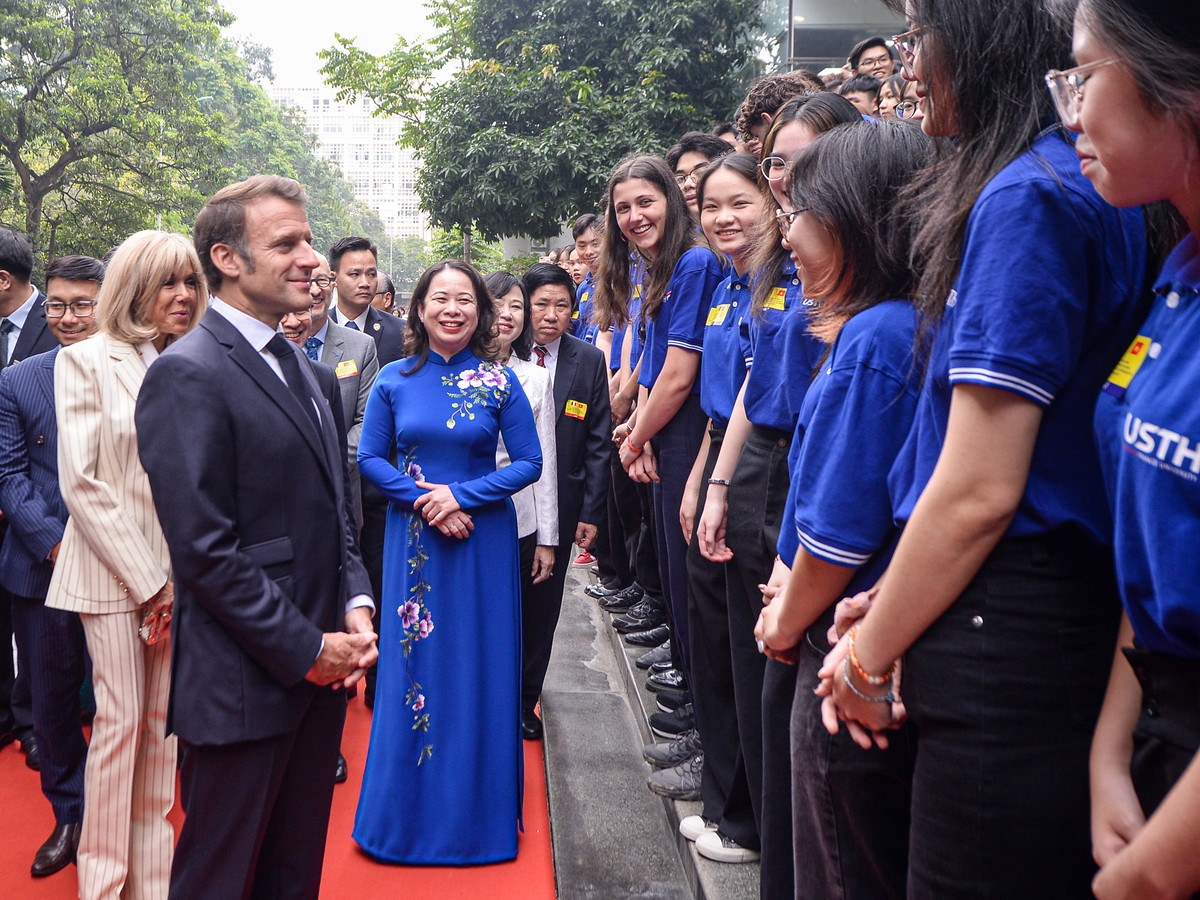 Phó Chủ tịch nước Võ Thị Ánh Xuân, Bộ trưởng Y tế Đào Hồng Lan cùng Tổng thống Pháp Emmanuel Macron và Phu nhân giao lưu cùng sinh viên Trường đại học Khoa học và Công nghệ Hà Nội.