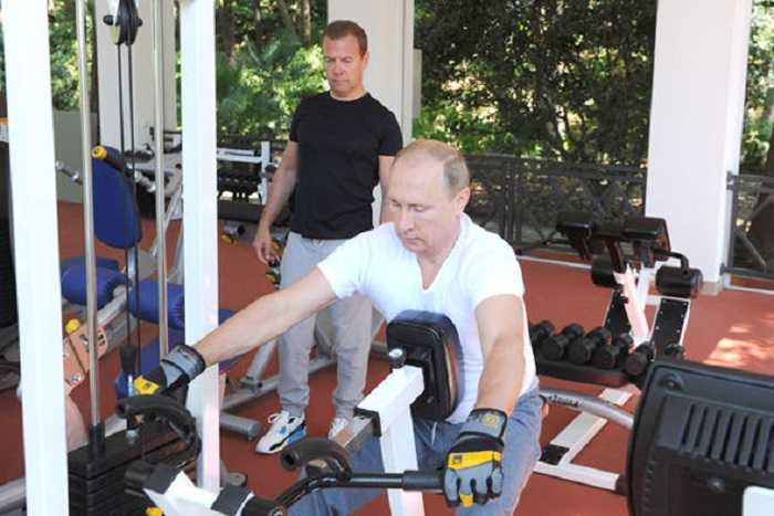 Điện Kremlin công bố những hình ảnh cho thấy Tổng thống Nga Vladimir Putin luyện tập thể hình cùng Thủ tướng Dmitry Medvede tại dinh thự Bocharov Ruchei ở Sochi vào dịp cuối tuần.