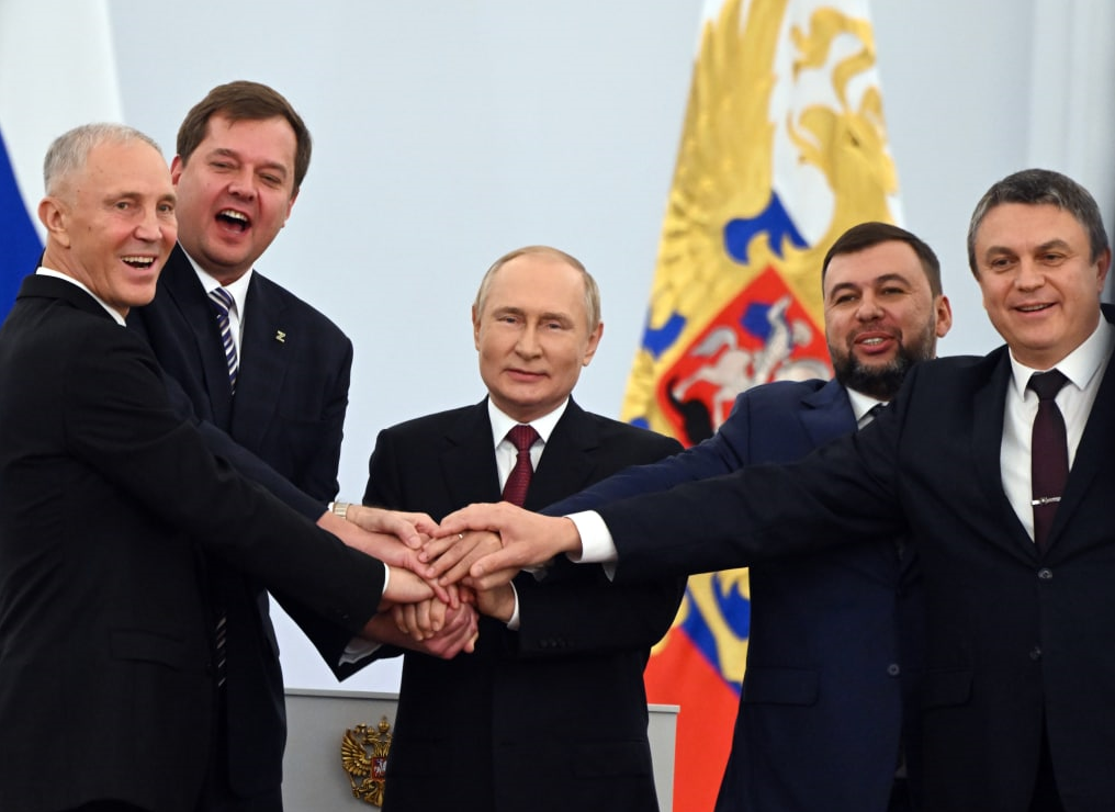 Sau bài phát biểu ngắn, Tổng thống Putin ký văn kiện với lãnh đạo Donetsk, Lugasnk, Zaporizhzhia và Kherson gồm, Denis Pushilin, Leonid Pasechnik, Yevgeny Balitsky và Vladimir Saldo. Chấp thuận 4 vùng này sáp nhập vào lãnh thổ Nga.