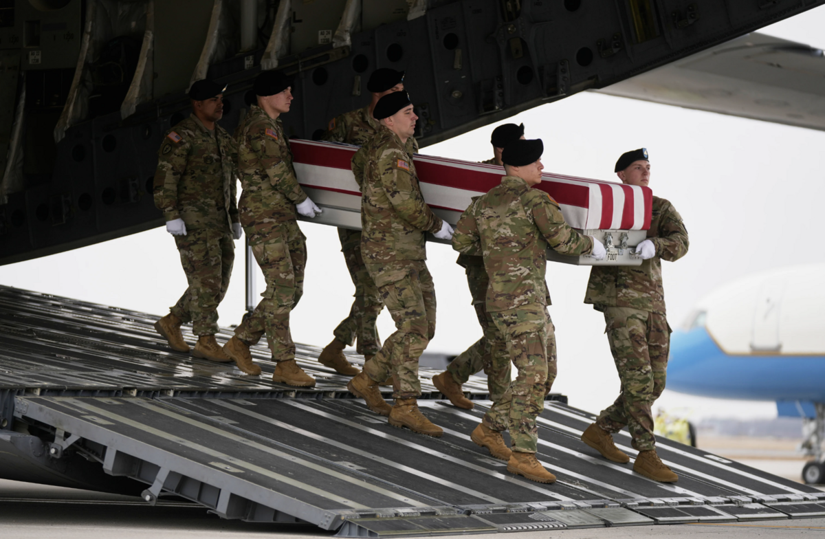 Trong nghi lễ kéo dài khoảng 30 phút, các quan tài phủ quốc kỳ Mỹ được đội danh dự quân đội lần lượt trang nghiêm đưa xuống từ máy bay quân sự, rồi chuyển lên xe chuyên dụng để đưa về nhà tang lễ. (Nguồn: AP)