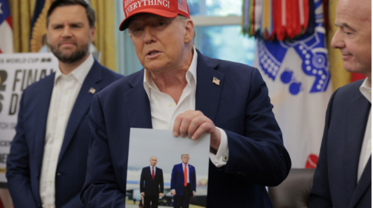 Tổng thống Donald Trump cầm bức ảnh chụp ông với Tổng thống Nga Vladimir Putin ở Alaska. (Ảnh: Getty)