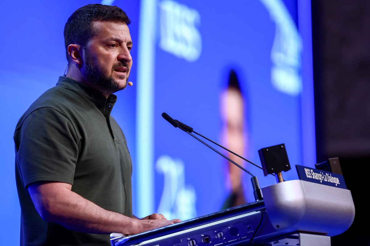 Tổng thống Ukraine Volodmyr Zelensky phát biểu tại Đối thoại Shangri-La 2024. (Ảnh: Reuters)