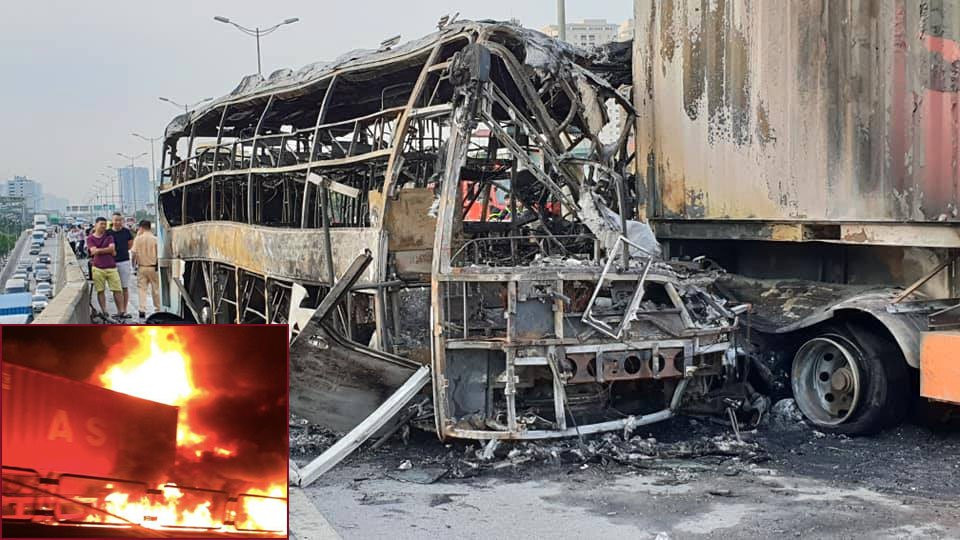 Chiếc xe khách giường nằm đang di chuyển trên đường vành đai đâm thẳng vào đuôi container đi cùng chiều. Sau cú đâm mạnh, xe container và xe khách giường nằm bốc cháy dữ dội.