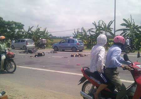 | Hiện trường vụ tai nạn giữa xe ba bánh và xe máy, làm 2 thanh niên tử vong tại chỗ |