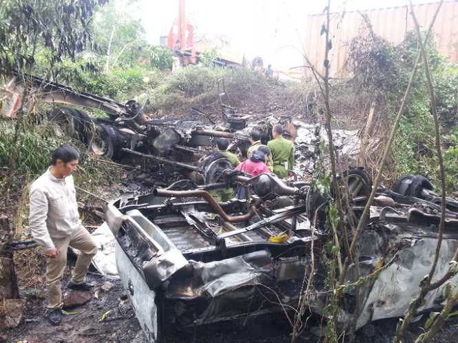 | Vụ tai nạn làm xe tuần tra của cảnh sát giao thông và phần đầu chiếc xe đầu kéo đều bị cháy trụi - Ảnh: Nguyên Linh |