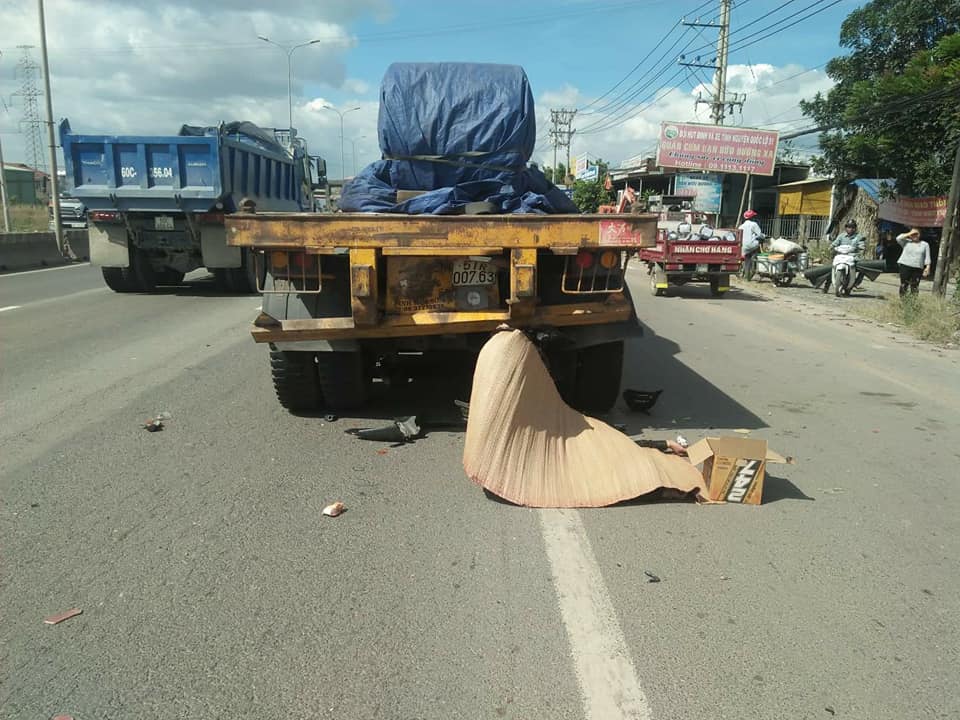Một lúc sau, xe máy mang BKS 60B2- 141.23 do một nam thanh niên cầm lái, chạy từ phía sau đến tông mạnh vào đuôi xe container.