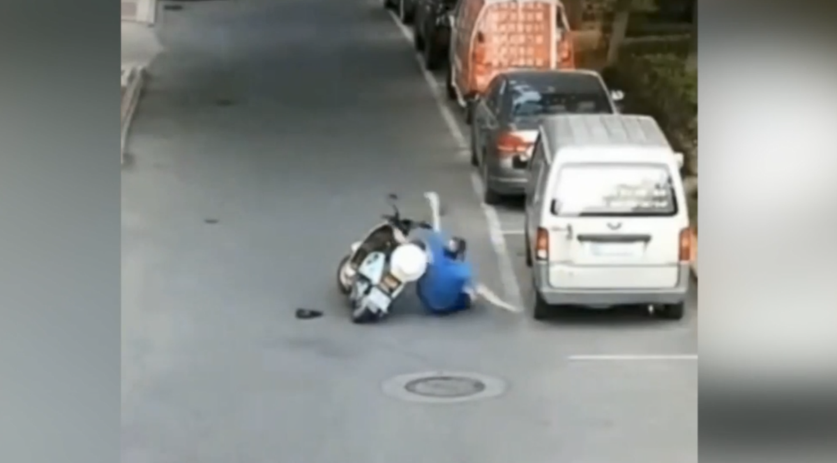 Hai xe máy va chạm, ngoái lại thấy đối phương ngã xuống đường, anh chàng áo xanh cũng vờ ngã lăn ra.