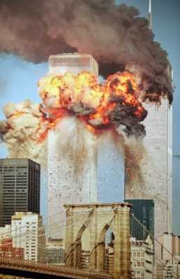 Khoảnh khắc biểu tượng kinh tế nước Mỹ - Tòa tháp đôi New York bị hai máy bay dân sự đâm vào. Mỹ đã lao vào cuộc chiến với Osama Bin Laden sau vụ khủng bố khiến cả nước Mỹ rúng động.