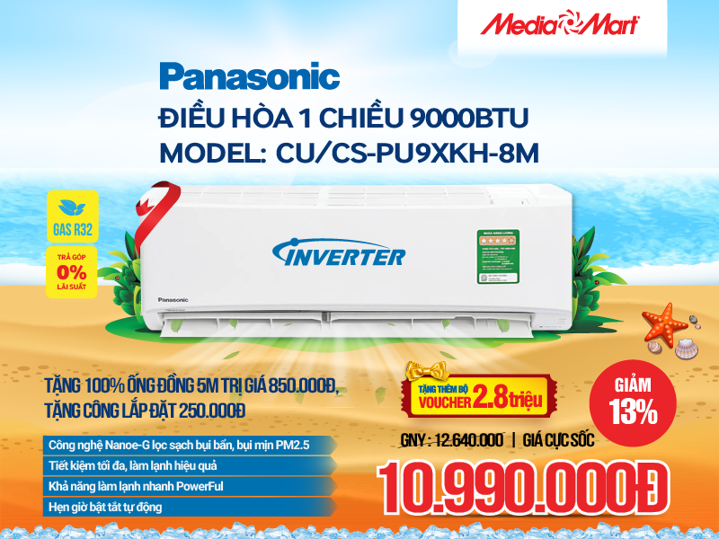 Không chỉ giảm giá, khi mua điều hòa Panasonic tại siêu thị điện máy MediaMart quý khách còn được tặng kèm PMH Evoucher trị giá 2.8 triệu đồng, tặng 100% ống đồng 5m trị giá 850.000 đồng, miễn phí công lắp đặt giá 250.000đ, trả góp lãi suất 0%,…