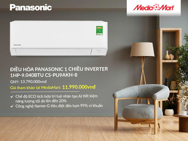 Đặc biệt, nhiều mẫu điều hòa Panasonic đang được giảm giá sâu tại hệ thống siêu thị điện máy MediaMart với ưu đãi hấp dẫn lên đến 50%, tặng kèm quà giá trị như máy xay sinh tố, lò vi sóng và miễn phí lắp đặt, vật tư trị giá 1,5 triệu đồng.
