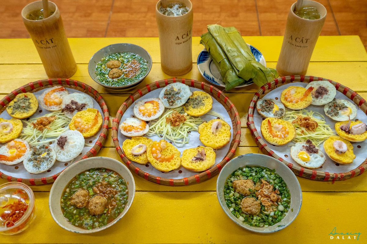Bánh căn là một trong những cái tên được rất nhiều thực khách yêu thích tìm kiếm khi lên Đà Lạt. Bánh căn được làm từ bột gạo ngon, một ít gia vị như muối để có vị, được đổ trong khuôn đất nung, bán theo một cặp được gập lại và nhân truyền thống bên trong là trứng cút hoặc trứng gà. Nhưng dạo gần đây, có một số quán thêm nhân hải sản, nhân thịt để khách du lịch có nhiều sự lựa chọn hơn.