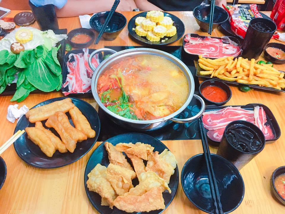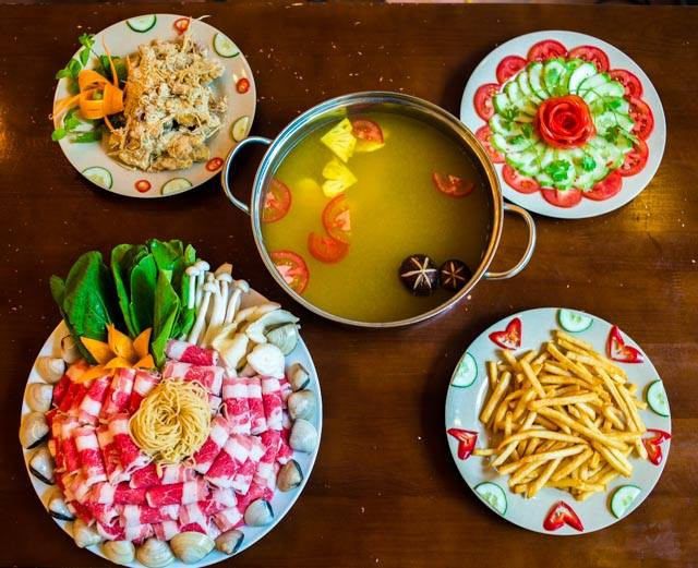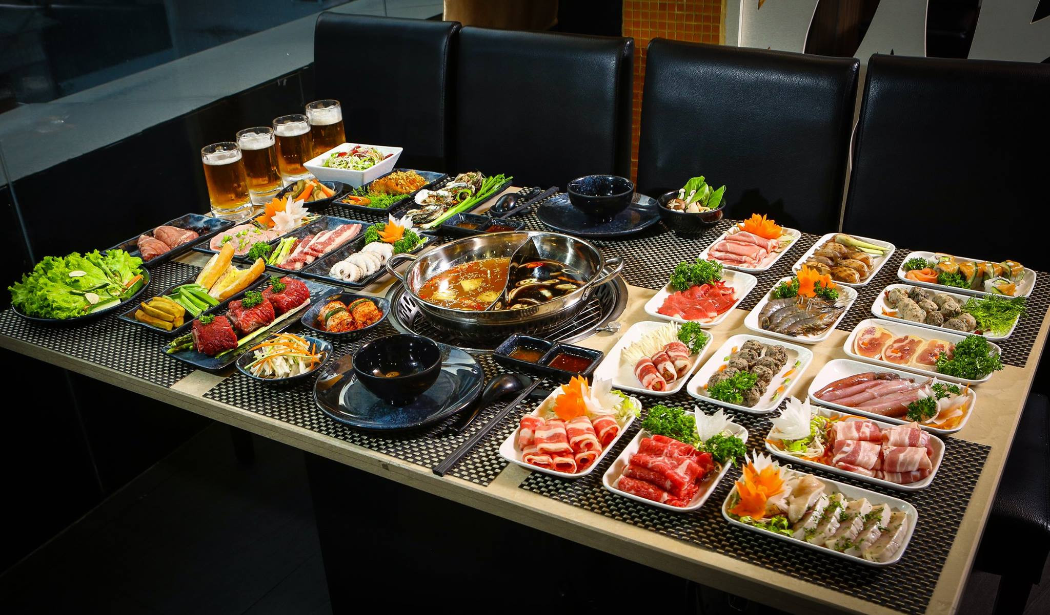 Ở nhà hàng có tới 6 loại nước lẩu khác nhau là: lẩu Tứ Xuyên, lẩu Thái Tom Yum, lẩu Kim Chi, lẩu rượu măng chua, lẩu nấm và lẩu riêu. Đồ nhúng thì siêu đa dạng các loại thịt như sườn sụn, bắp bò, bò cuốn nấm kim châm, thịt gà, cá, tôm, ngao, mực không thiếu thứ gì.