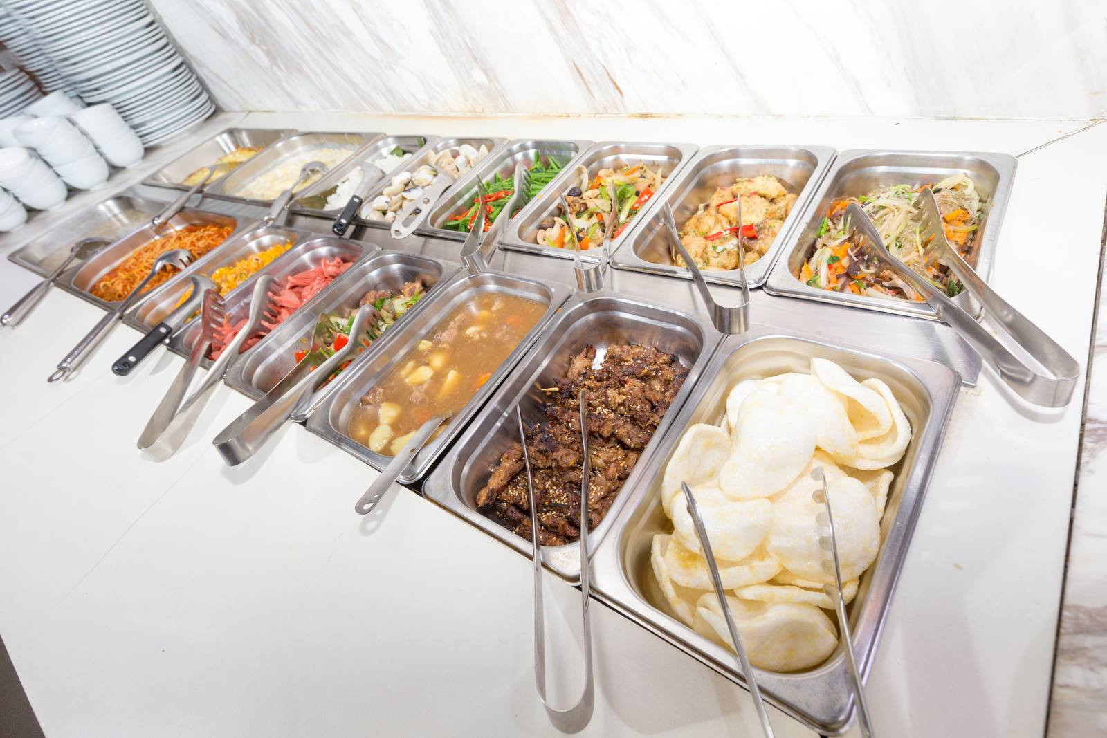 Trong nhà hàng có sẵn một quầy buffet bày biện nhiều món khai vị để ăn kèm lẩu như phở cuốn, ngao xào me, cánh gà sốt chua ngọt, nộm, sụn rang muối, salad… Ngoài ra, các đồ nhúng lẩu cũng được bày sẵn tại đây như rau, đậu, bánh đa, bún, mì tôm… Một nồi lẩu ở đây được chia thành 2 ngăn để bạn có thể tùy ý chọn 2 loại nước lẩu yêu thích.