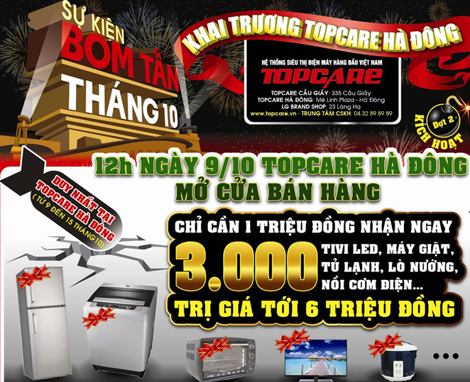 Với hóa đơn mua hàng trên 1 triệu đồng – 3.000 khách hàng đầu tiên sẽ nhận ngay một trong 3.000 quà tặng Tivi LED, tủ lạnh, máy giặt hoặc nồi cơm điện… tại Topcare Hà Đông từ ngày 9đến 15/10/2012.