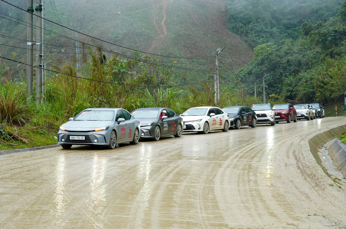 Đoàn xe Toyota Hybrid vượt qua cung đường đèo trong thời tiết mưa lạnh.