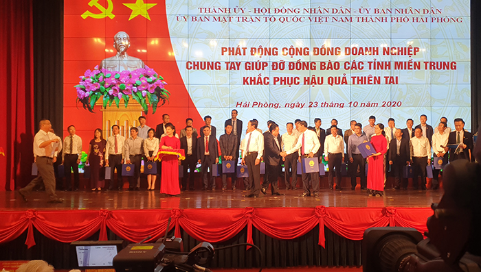 Sáng 23/10, Thành ủy, Hội đồng Nhân dân, Ủy ban Nhân dân, Ủy ban Mặt trận Tổ quốc Việt Nam TP Hải Phòng mở cuộc vận động các doanh nghiệp, địa phương tại Hải Phòng chung tay ủng hộ đồng bào miền Trung khắc phục thiệt hại sau đợt thiên tai, bão lũ vừa qua.