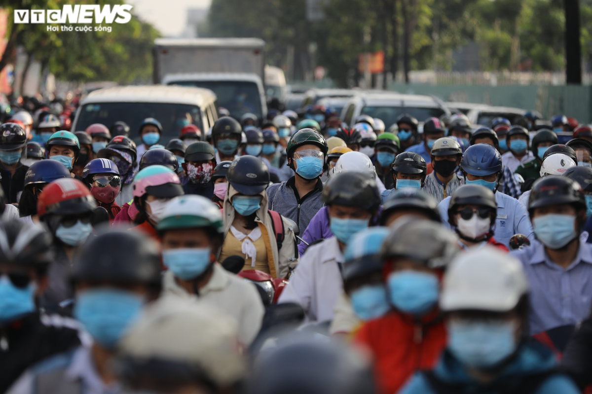 Từ sáng, hàng dài xe nối đuôi nhau kẹt cứng tại chốt kiểm soát dịch quận Gò Vấp. Mặc dù quận đã phân bổ mỗi chốt 10 cán bộ kiểm soát gồm công an, CSGT, dân quân tự vệ kiểm tra giấy tờ người đi đường nhưng tình trạng ùn tắc vẫn diễn ra giống như lần áp dụng Chỉ thị 16 hồi tháng 6.
