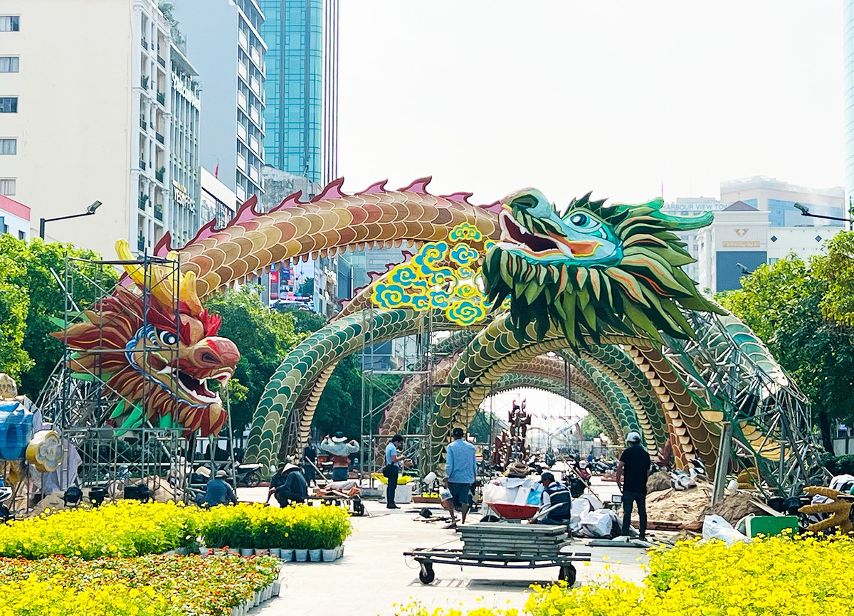 Chiều 31/1, công nhân thi công đường hoa Nguyễn Huệ (quận 1) đang tất bật thi công để kịp tiến độ. Ngay cổng vào của đường hoa là vị trí của hai linh vật rồng lớn với tên gọi "Lưỡng Long triều liên" (đôi rồng chầu sen). Miệng rồng ngậm ngọc đường kính 50cm được mô phỏng bằng nhựa mica, bên trong chứa đèn thắp sáng. Thân rồng đan chéo vào nhau tạo mái trần trang trí đẹp mắt và thông thoáng.
