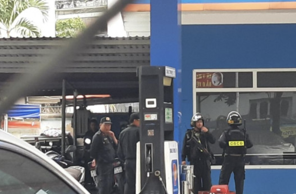 Hàng chục cảnh sát phong toả cây xăng ở quận Gò Vấp. (Ảnh: Khuất Nguyên)