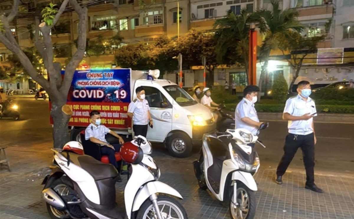 Lực lượng chức năng kiểm tra các cơ sở kinh doanh, ăn uống tụ tập đông người trên đường Phan Xích Long. (Ảnh: Thy Huệ)