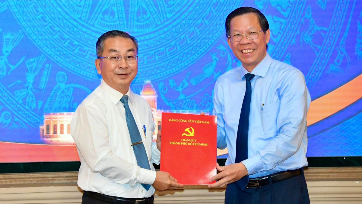 Chủ tịch UBND TP.HCM Phan Văn Mãi (phải) trao quyết định cho ông Võ Ngọc Quốc Thuận. (Ảnh: Thành ủy TP.HCM)