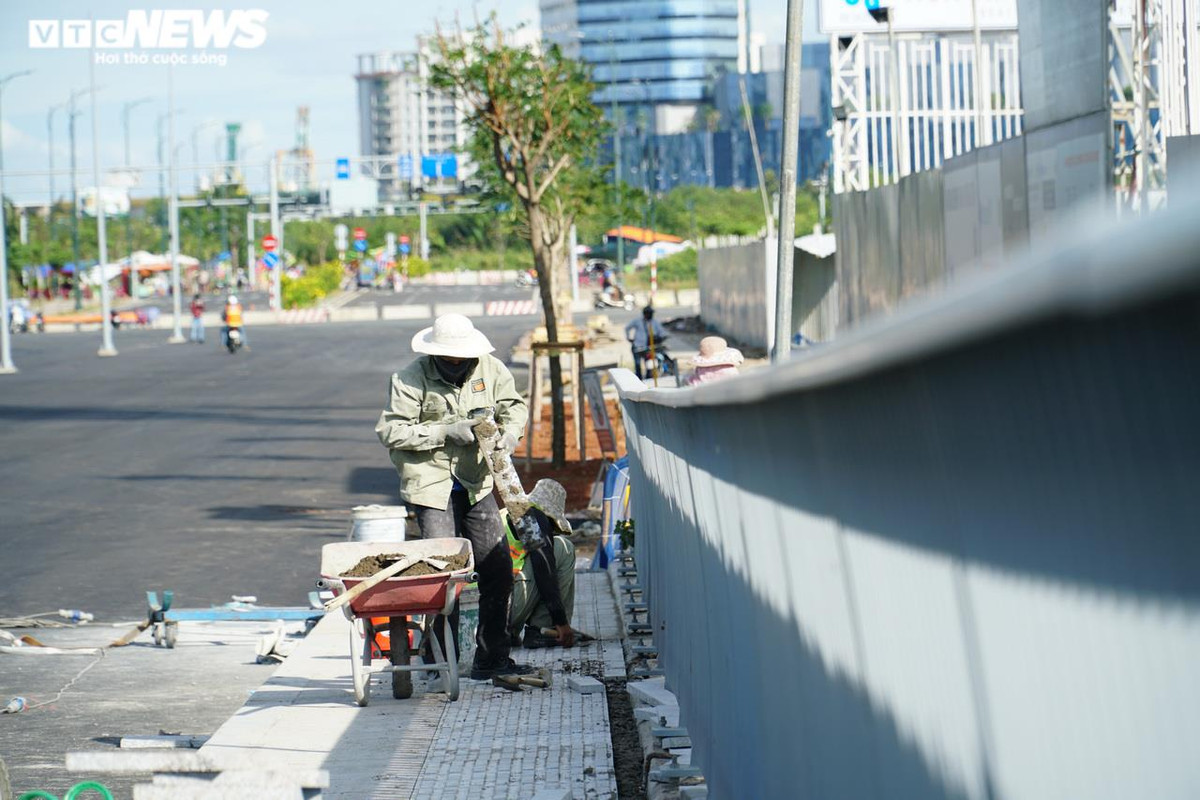 Đường đầu cầu phía quận 1 hiện đang thảm nhựa, hoàn thiện vỉa hè, cây xanh, hệ thống chiếu sáng…