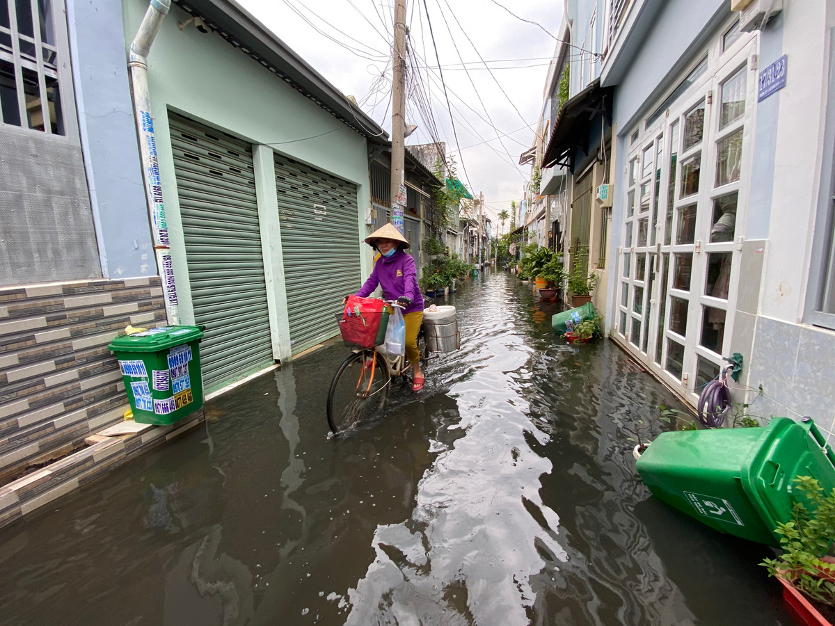 Ghi nhận của PV VTC News chiều 4/11, nhiều hộ tại khu dân cư ở phường Hiệp Bình Chánh, TP Thủ Đức, TP.HCM vẫn đang chịu cảnh sống chung với nước.