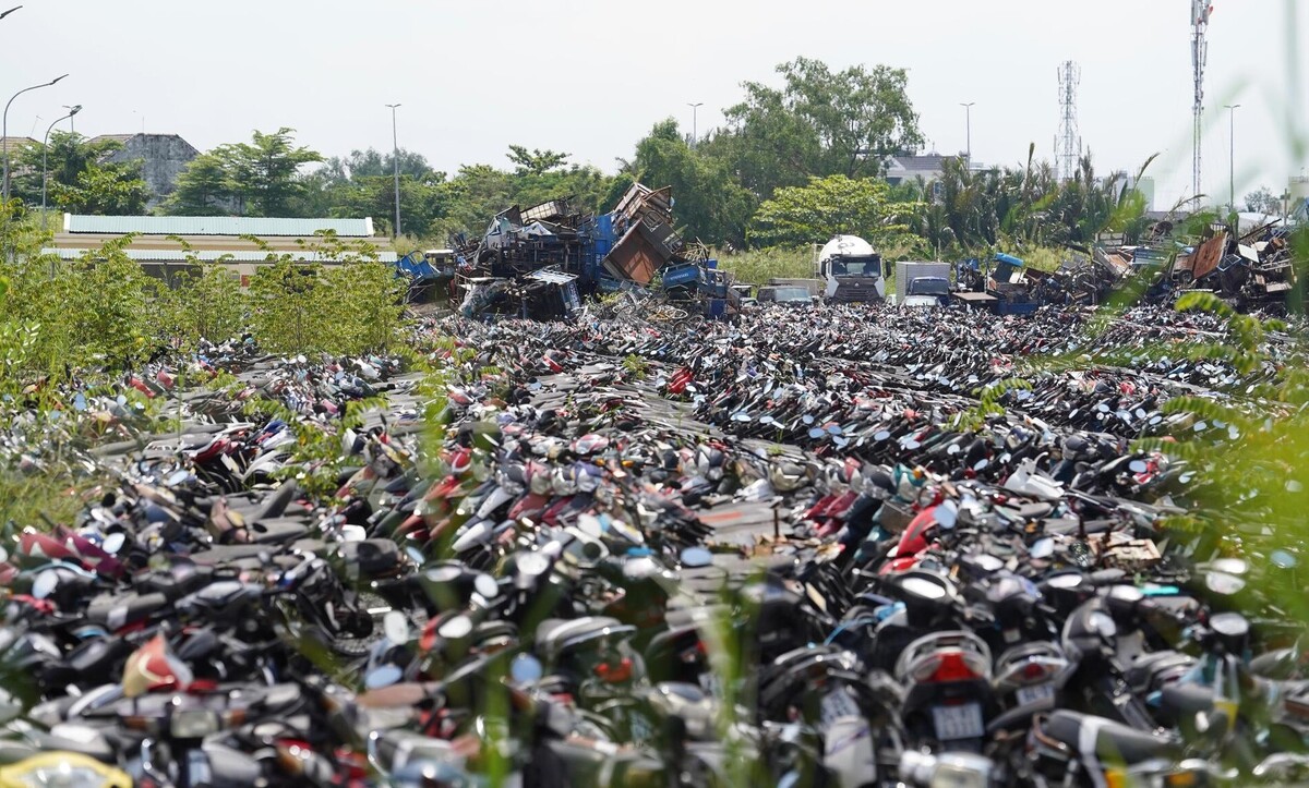 Các phương tiện này được chất thành từng “núi” tại bãi tạm giữ tang vật, phương tiện vi phạm hành chính khu Sha T30 (xã Nhà Bè).