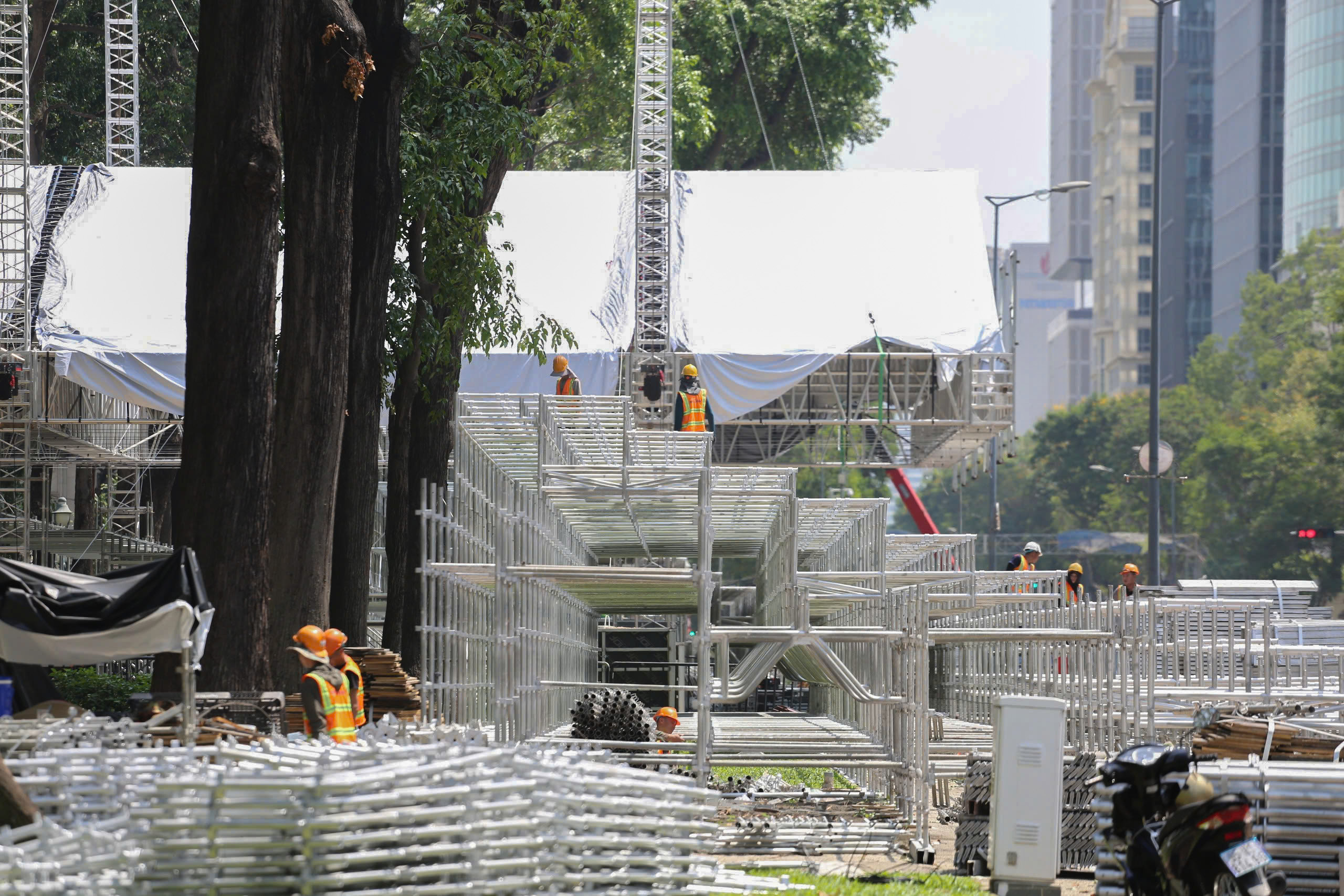 Theo quan sát, các đơn vị thi công tập kết vật liệu, thiết bị dựng khán đài, sân khấu, tiến hành lắp ghép dàn giáo.