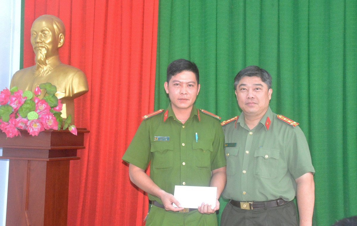 Đại tá Lê Hoài Phong, Trưởng Công an quận Tân Bình trao thưởng đột xuất cho Trung úy Trần Nhật Duy. (Ảnh: Phú Lữ)