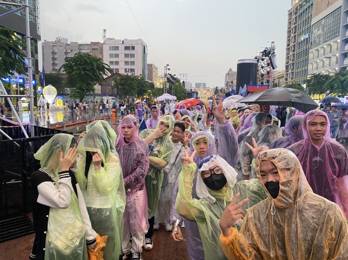 Cùng xếp hàng cạnh khu vực sân khấu, nhóm của chị Diệu Minh (20 tuổi, TP Thủ Đức) kể rằng sẽ chờ xem đếm ngược và bắn pháo hoa tầm cao. Dù mưa đổ xuống bất ngờ nhưng chị Diệu Minh vẫn không xem đó là điều gì gây trở ngại.