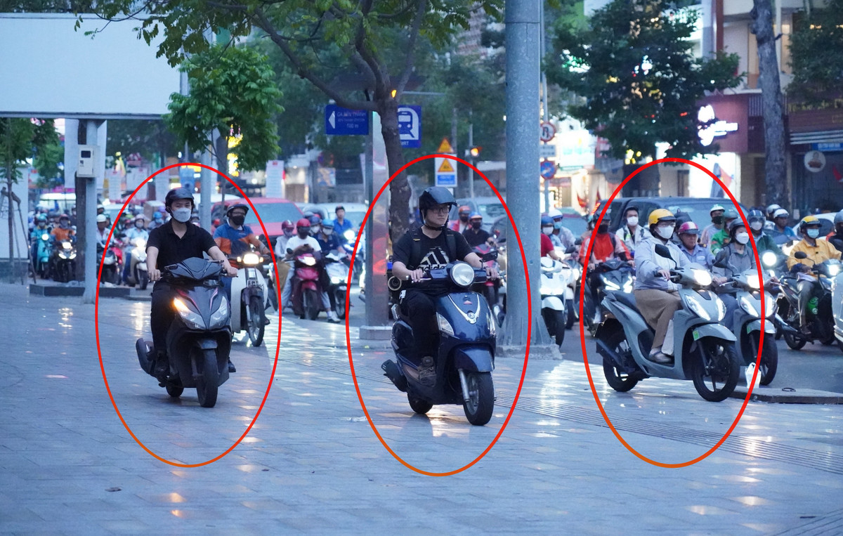 Tương tự, tại đường Nguyễn Thái Học và đường Cách Mạng Tháng 8 và đường 3/2, nhiều người điều khiển xe máy cũng ngang nhiên leo lề đường, bất chấp hình phạt "cứng" của nghị định 168.