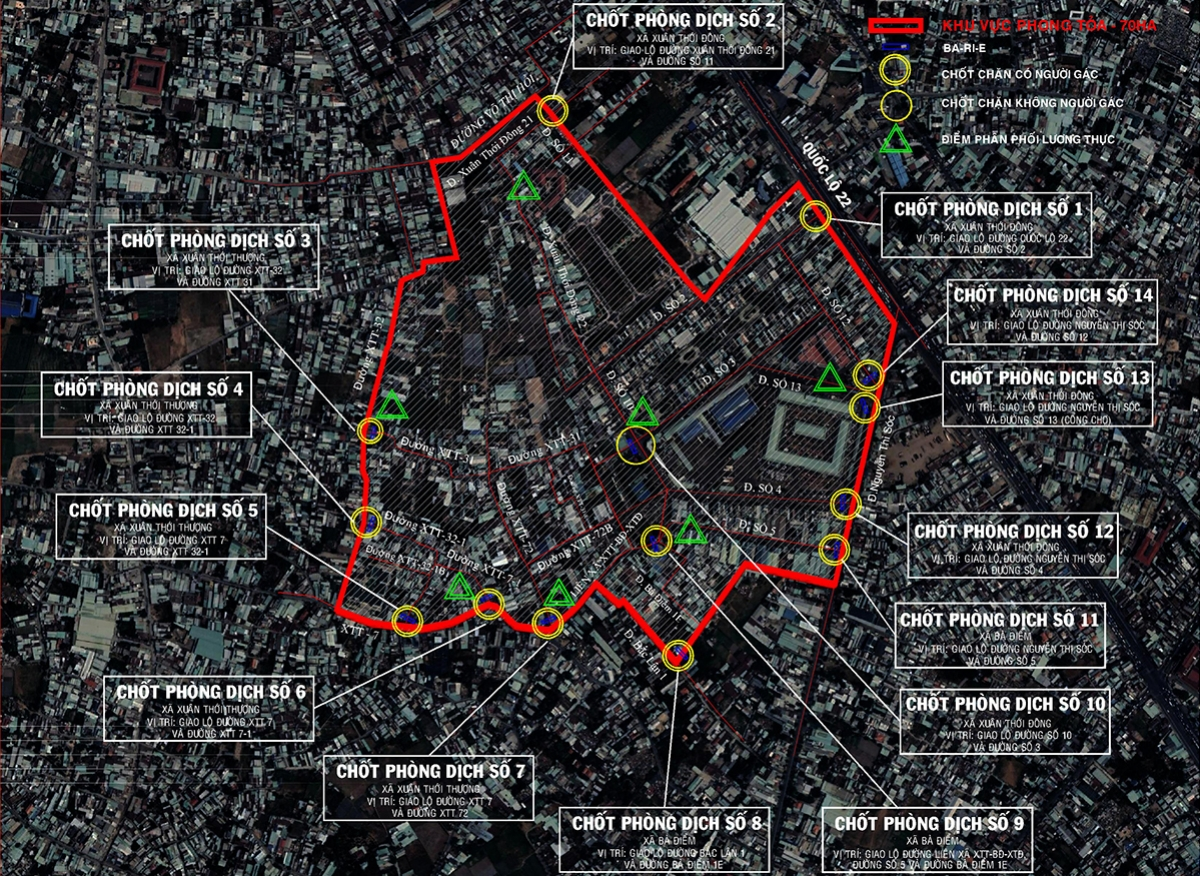Ba khu vực phong toả là một phần ấp 3, xã Xuân Thới Thượng; ấp Bắc Lân xã Bà Điểm và toàn bộ ấp Mỹ Hoà 4 xã Xuân Thới Đông, gồm 12 chốt kiếm soát. Thời gian thực hiện 14 ngày, từ 0h hôm nay (30/6).