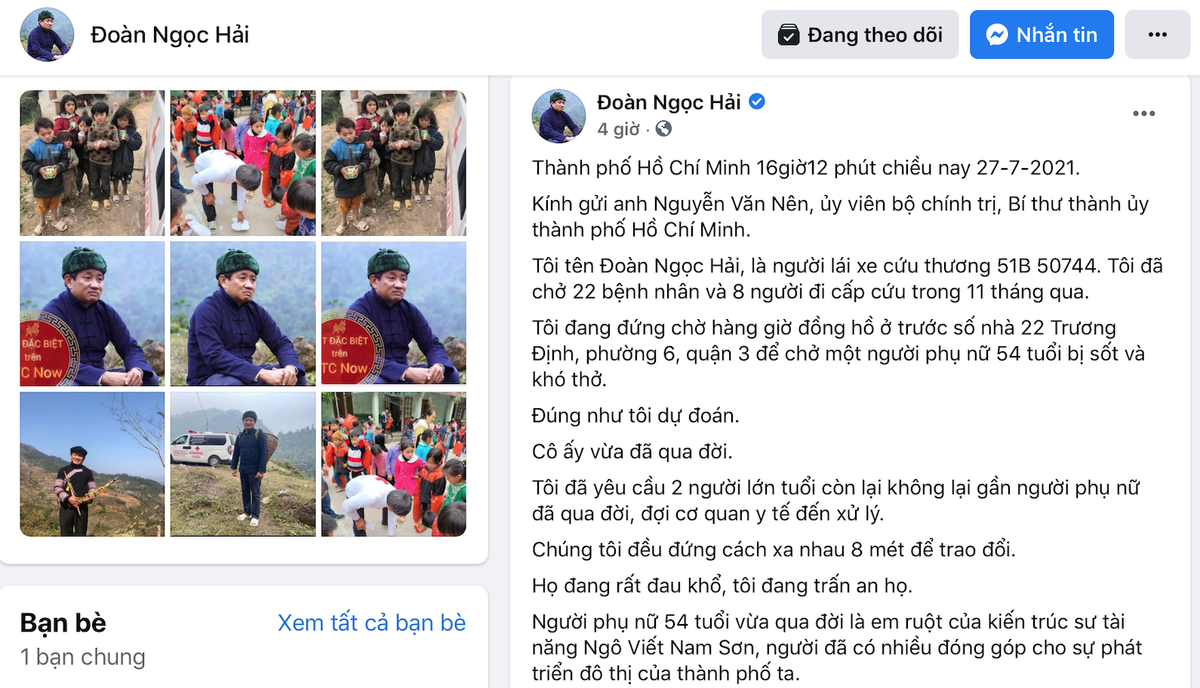 Chiều 27/7, trên trang Facebook cá nhân, ông Đoàn Ngọc Hải (nguyên Phó Chủ tịch UBND quận 1, TP.HCM) đăng tải nội dung phản ánh về một trường hợp bệnh nhân nghi nhiễm COVID-19 mất trước sự chứng kiến của ông.