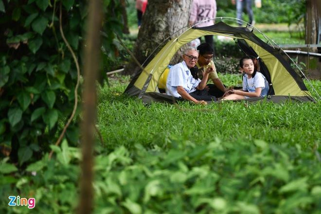 Chị Liễu (quận 2) đưa các con đến Thảo Cầm Viên chơi nhân dịp nghỉ lễ Quốc khánh. Chị mang theo chiếc lều nhỏ đủ chỗ cho 3 mẹ con. "Biết được đi chơi nên các cháu háo hức lắm, 5h sáng đã gọi mẹ dậy chuẩn bị đồ đạc. Tôi đến từ 10h và dự định sẽ chơi ở đây đến chiều tối", chị Liễu chia sẻ.