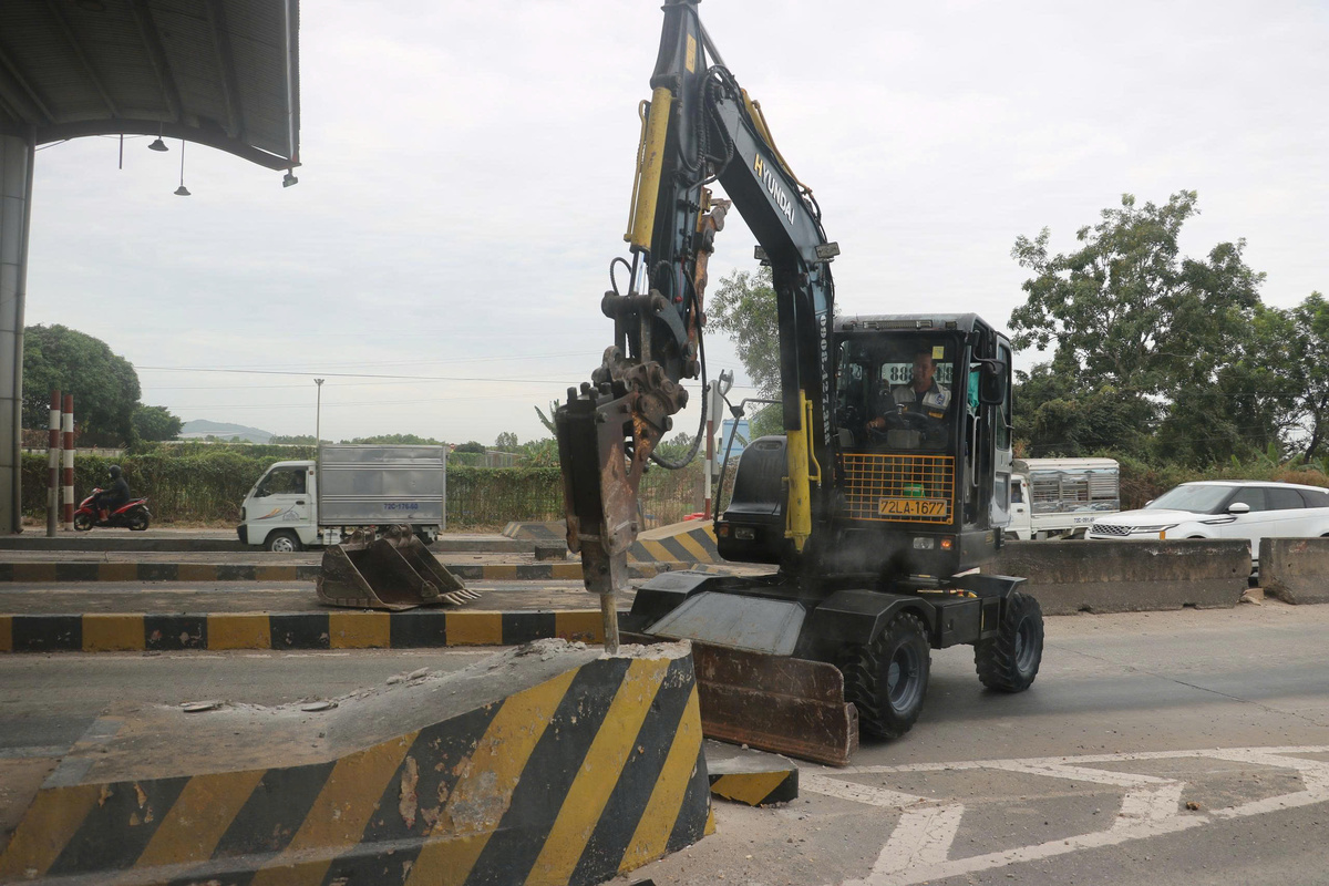 Tại hiện trường, hai xe đục bê tông chuyên dụng được huy động phá dỡ các hạng mục nhà trạm, đảo phân luồng và móng trụ. Dù một số làn ô tô phải tạm đóng, song nhờ phương án tổ chức giao thông hợp lý, lưu lượng phương tiện qua khu vực ổn định, không xảy ra ùn tắc.